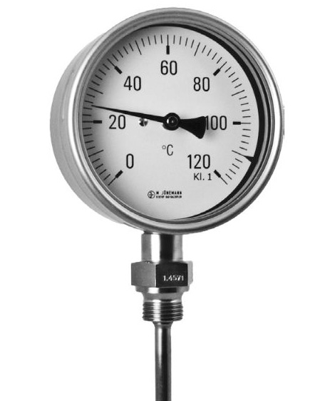 Totalmente de acero inoxidable, tornillo de calibración, escala en °C. Bisel tipo bayoneta, diámetro de bulbo 6mm, hilo 1/2″ NPT. Precisión 1%.