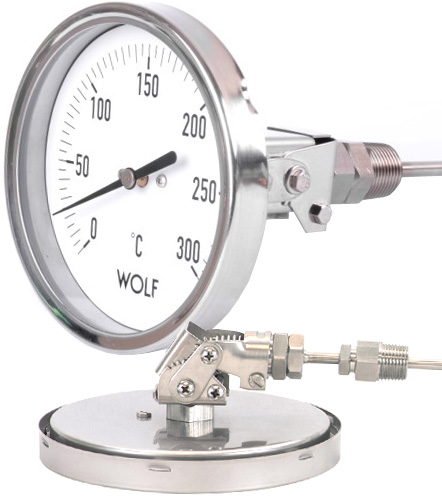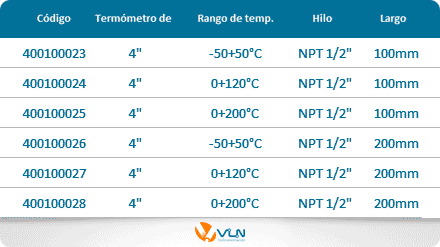 Totalmente de acero inoxidable, tornillo de calibración, escala en °C, bisel tipo bayoneta, diámetro de bulbo 6mm, hilo 1/2″ NPT. Precisión 1%